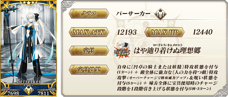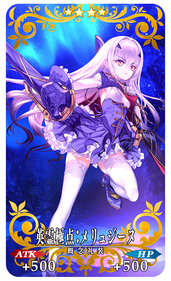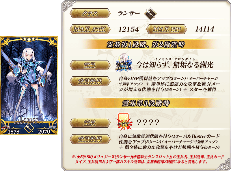 ※「★5(SSR)美露莘(Lancer)(妖精騎士蘭斯洛特)」,只限靈基再臨第1階段或第2階段的情況,在戰鬥中使用特定技能的話會變化成靈基再臨第3階段,可變化一部份技能的效果與寶具效果。另外,以技能效果變化成靈基再臨第3階段,在該場戰鬥中使用同様技能後不會返回第1・第2階段。 ※靈基再臨至第3階段後,想使用第1・第2階段時的寶具及技能的情況,於從者詳細畫面將戰鬥角色的設定變更成第1階段或第2階段才能使用。 ※特定靈基再臨階段解放前,「變化後的寶具卡」的一部份立繪不會顯示。 ※「★5(SSR)美露莘(Lancer)(妖精騎士蘭斯洛特)」是「★5(SSR)妖精騎士蘭斯洛特」靈基再臨到第2階段後名稱會變成「★5(SSR)美露莘」。 ※「★5(SSR)美露莘(Lancer)(妖精騎士蘭斯洛特)」的靈基再臨第3階段包含「Lostbelt No.6 妖精圓卓領域 阿瓦隆・勒・菲 星辰誕生之刻」的劇透。敬請注意。