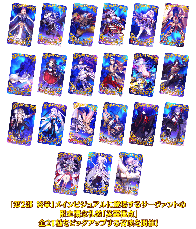 在「第2部 終章」主視覺圖登場從者的限定概念禮裝「英靈極點」,舉辦共21種Pick Up的召喚!