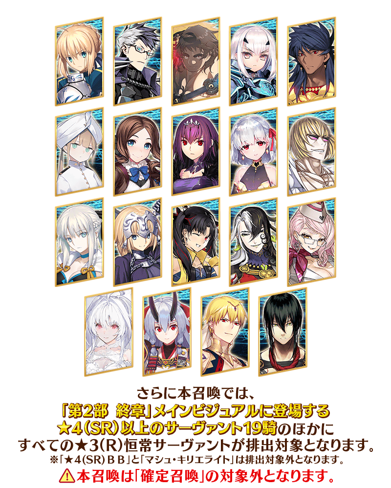 ※本召喚中,在「第2部 終章」主視覺圖登場的19位★4(SR)以上從者外,所有的★3(R)常駐從者皆為抽出對象。 ※「★4(SR)BB」與「瑪修・基利艾拉特」,本召喚中為抽出對象外。 ※在2018年12月31日(二) 23:00以後新配信的主線故事及期間限定活動、一部份關卡、宣傳活動及召喚中,會顯示隱藏真名的對象從者真名。