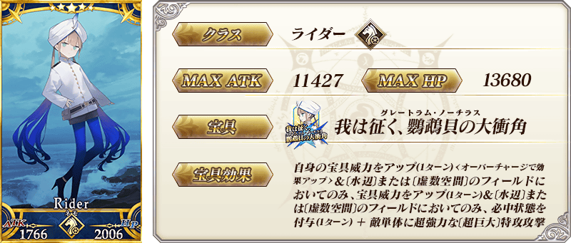 本召喚中成為抽出對象的從者,是12月10日(三) 17:00~12月31日(三) 22:59的期間舉辦的『「第2部 終章」開幕! 全從者Pick Up召喚』的Pick Up對象。