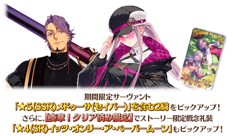 從「奏章Ⅰ」關聯從者之中,舉辦期間限定從者「★5(SSR)美杜莎(Saber)」、故事召喚從者「★4(SR)難敵」Pick Up的召喚!
