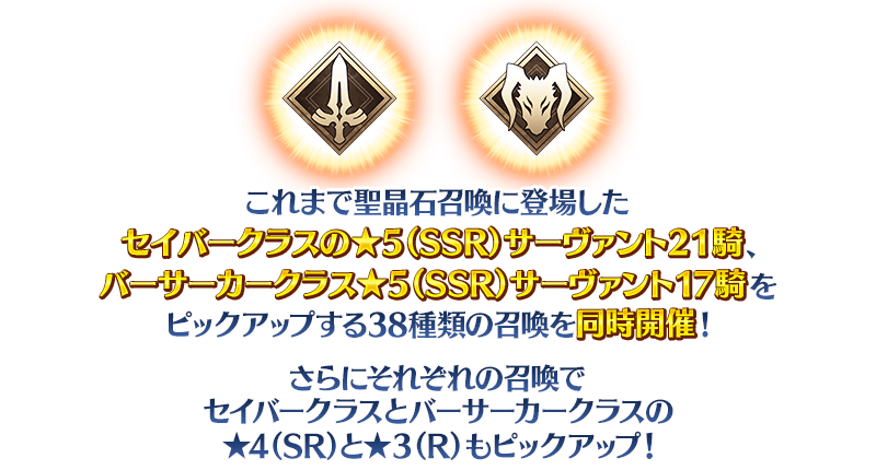 配合期間限定『「冠位戴冠戰:Saber」&「冠位戴冠戰:Berserker」Storm Pod消耗0!宣傳活動』,目前為止的聖晶石召喚登場的包含期間限定從者的48位Saber職階、36位Berserker職階Pick Up的38種的召喚同時舉辦!