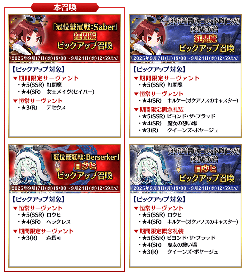 「★5(SSR)紅閻魔」「★5(SSR)婁希」於『「冠位戴冠戰:Saber」&「冠位戴冠戰:Berserker」Pick Up召喚』中Pick Up外,自9月7日(日) 17:00舉辦的「失落的創世(Vanished Beginning) 來自未來的方舟Pick Up2召喚」中也Pick Up。