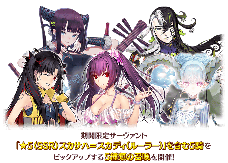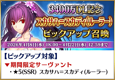 為了記念3400萬DL突破,舉辦包含期間限定從者「★5(SSR)斯卡薩哈=斯卡蒂(Ruler)」的5位Pick Up的5種召喚!