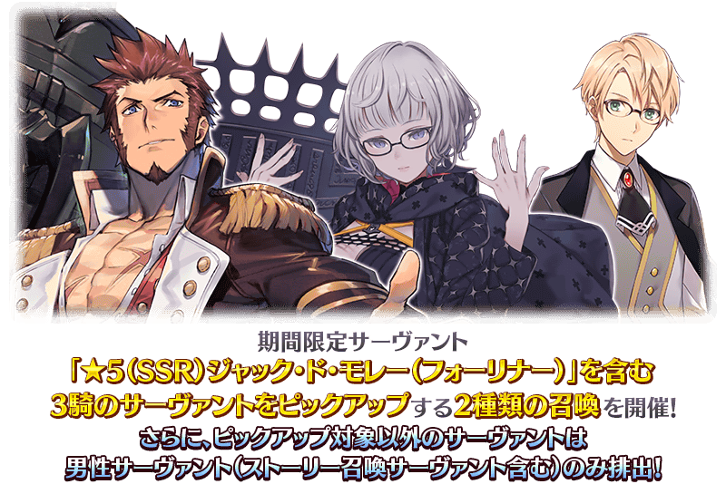 本召喚中,Pick Up從者的「★5(SSR)雅克・德・莫萊(Foreigner)」以外的抽出對象只限男性從者(包含故事召喚從者)!