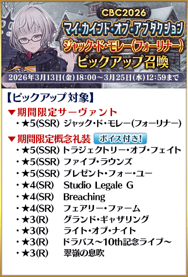 為了記念期間限定活動「CBC2026 自我風格的綁架案 ~兩位莫萊與無盡的遺產~」的開幕,舉辦包含期間限定從者「★5(SSR)雅克・德・莫萊(Foreigner)」的3位從者Pick Up的2種召喚!