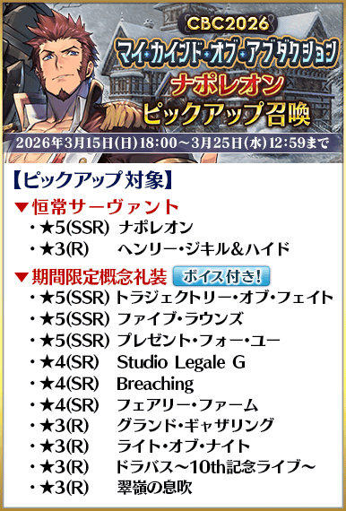 2026年3月9日(一) 3:00~13:00之間,在登入時顯示的『「CBC2026」開幕前夕倒數登入獎勵』的對話框中,因顯示的概念禮裝「★3(R)グランド・ギャザリング」圖片內的「尼莫/諾亞」的圖像有錯誤而進行修正。