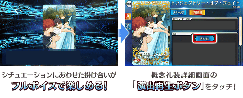 語音可在入手概念禮裝時的初次召喚演出時或在從禮物箱初次入手時聆聽。