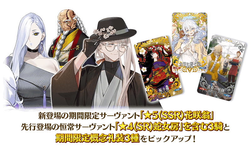為了記念期間限定活動「迦勒底的花神節 當你的花朵綻放時」的開幕,包含新登場的期間限定從者「★5(SSR)花咲翁」、先行登場的常駐從者「★4(SR)蛇女房」的3位與3種期間限定概念禮裝Pick Up!