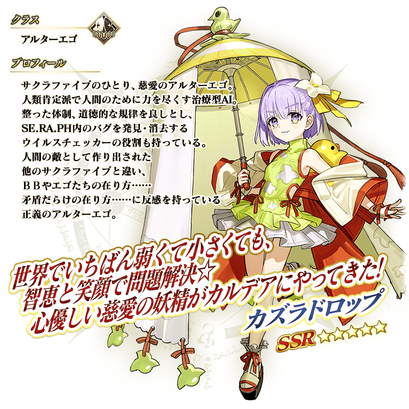 ※上述「★5(SSR)Kazuradrop」的立繪與卡面為靈基再臨第3階段。 ※「★5(SSR)Kazuradrop」的寶具會根據再臨階段變化名稱與演出。