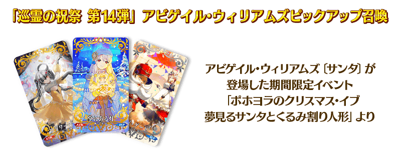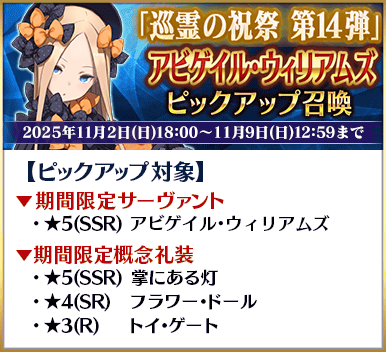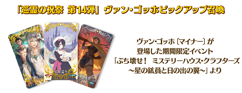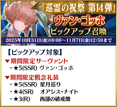 從「巡靈的祝祭 第14彈」對象從者關聯從者之中,舉辦期間限定從者「★5(SSR)梵谷」與「★5(SSR)艾比蓋兒・威廉斯」Pick Up的2種召喚!