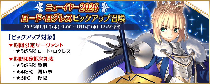 為了記念迎接2026年,新登場的期間限定從者「★5(SSR)君主・羅格雷斯」與3種期間限定概念禮裝Pick Up!