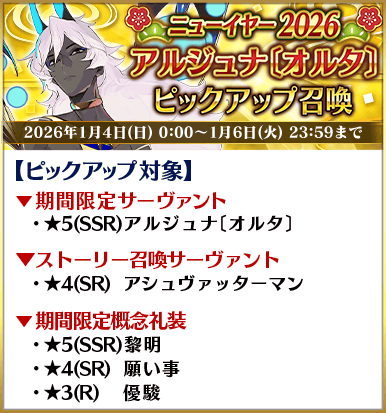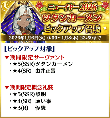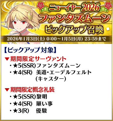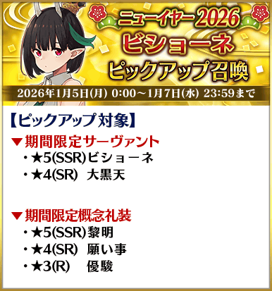 期間限定「New Year 2026Pick Up召喚」的舉辦期間中,因資料庫伺服器更新而預定實施維修。維修中無法進行遊玩遊戲及召喚,敬請見諒。
