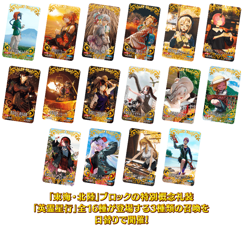 ※本召喚中,只限16種特別概念禮裝「英霊星行」的「東海・北陸」地區中繪製的全13位從者成為抽出對象。請注意配布從者「★4(SR)宇津見繪里世(Lancer)」、「★1(C)保羅・班揚」、「★4(SR)李奧納多・達・文西(Ruler)」並非抽出對象。