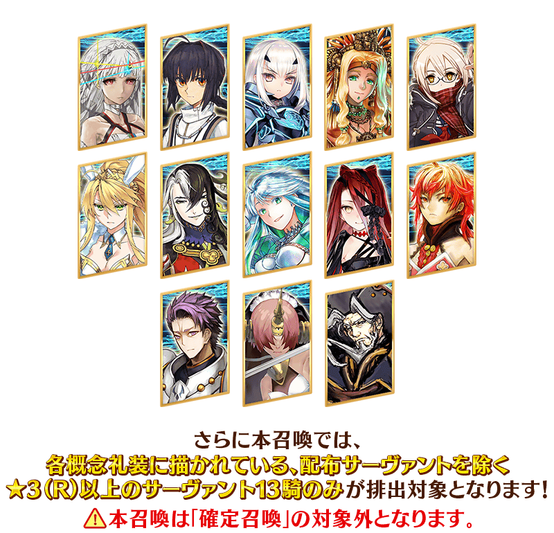 並且本召喚中,只限在各概念禮裝繪製的13位從者為抽出對象!
