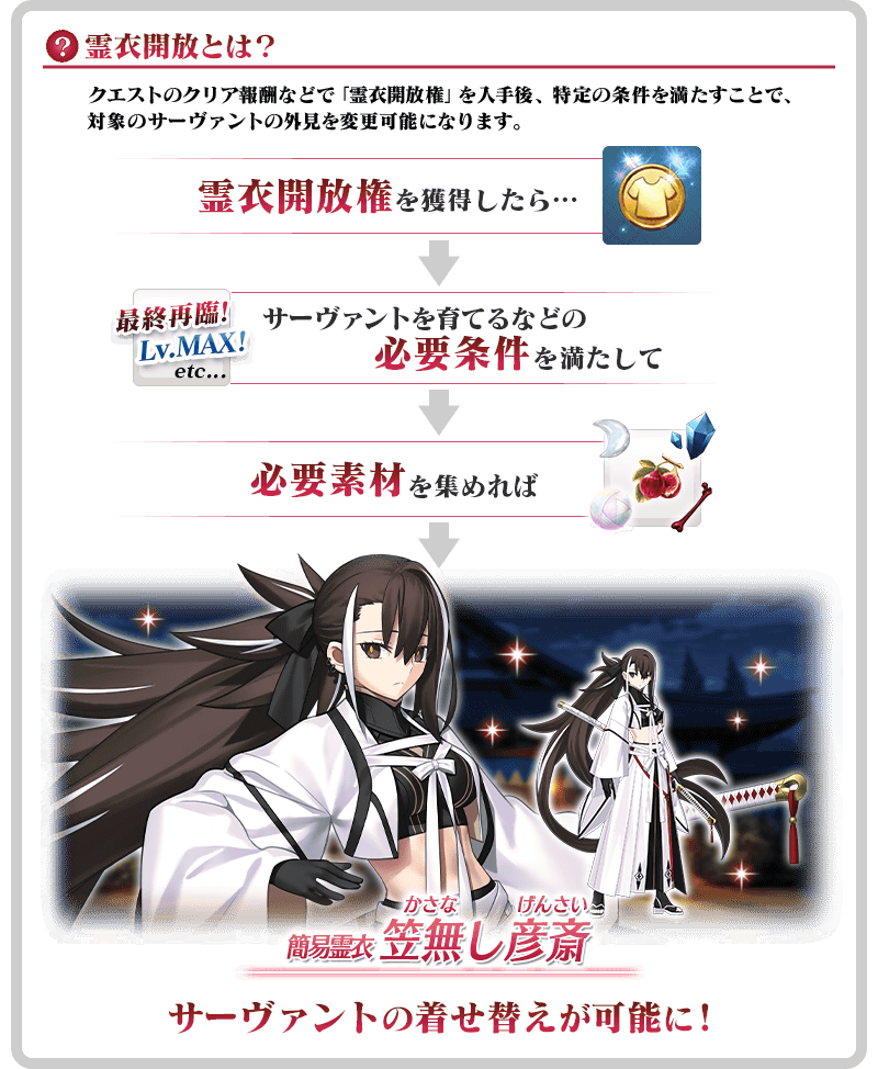 ※「靈衣開放」後戰鬥形象及頭像將自動切換。透過從者詳情介面可以變更回「靈衣開放」前的狀態或其他靈基再臨階段。 ※「靈衣開放」對職階或數值等無影響。