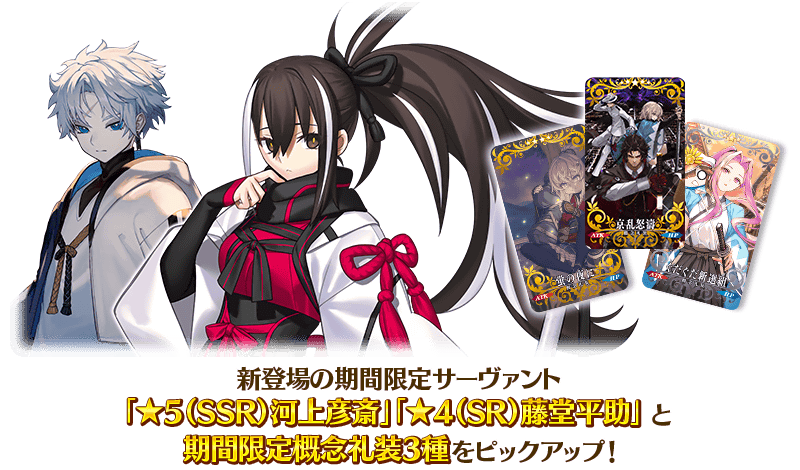 為了記念期間限定活動「幕末交鋒神話 嘮嘮叨叨新選組・THE・END REVENGE OF MAKOTO」的開幕,新登場的期間限定從者「★5(SSR)河上彥齋」「★4(SR)藤堂平助」與3種期間限定概念禮裝Pick Up!