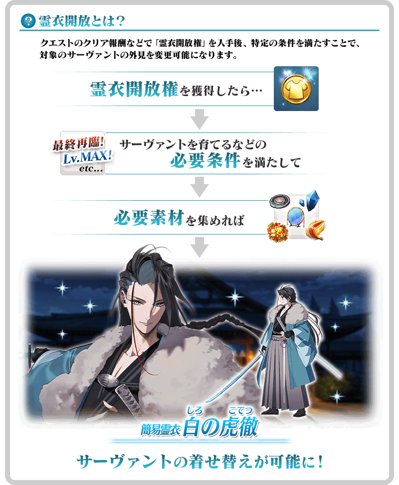※對象的靈衣開放權只限期間限定活動「幕末交鋒神話 嘮嘮叨叨新選組・THE・END REVENGE OF MAKOTO」的活動舉辦期間才能入手。 ※請注意未持有對象靈衣開放權的對象從者情況,可入手靈衣開放權,但無法進行靈衣開放。 ※對象的靈衣是只變化外觀,語音無變化的「簡易靈衣」。