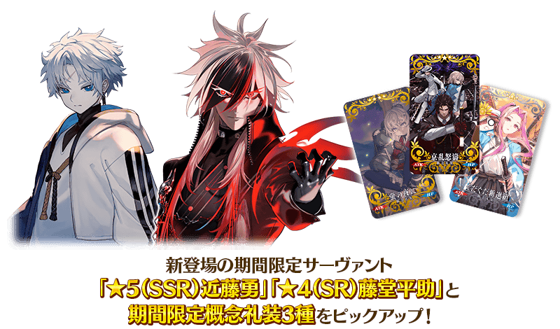 為了記念期間限定活動「幕末交鋒神話 嘮嘮叨叨新選組・THE・END REVENGE OF MAKOTO」的開幕,新登場的期間限定從者「★5(SSR)近藤勇」「★4(SR)藤堂平助」與3種期間限定概念禮裝Pick Up!