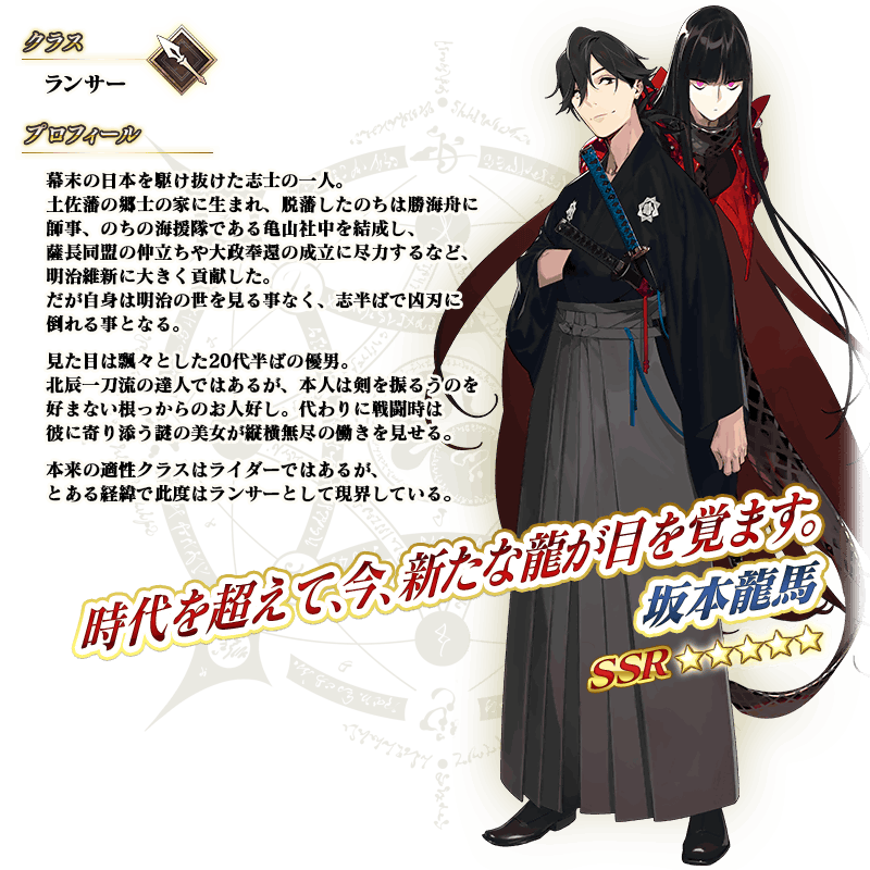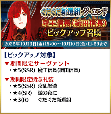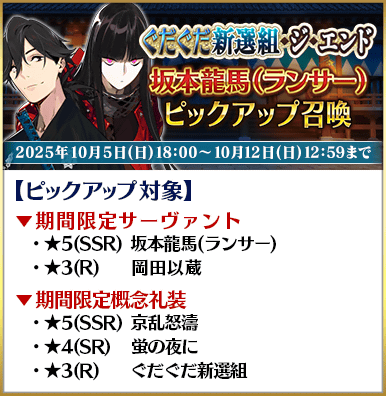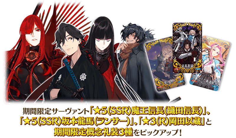 為了記念期間限定活動「幕末交鋒神話 嘮嘮叨叨新選組・THE・END REVENGE OF MAKOTO」的開幕,期間限定從者「★5(SSR)魔王信長(織田信長)」、「★5(SSR)坂本龍馬(Lancer)」、「★3(R)岡田以藏」與3種期間限定概念禮裝Pick Up!