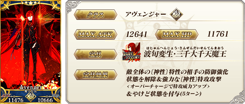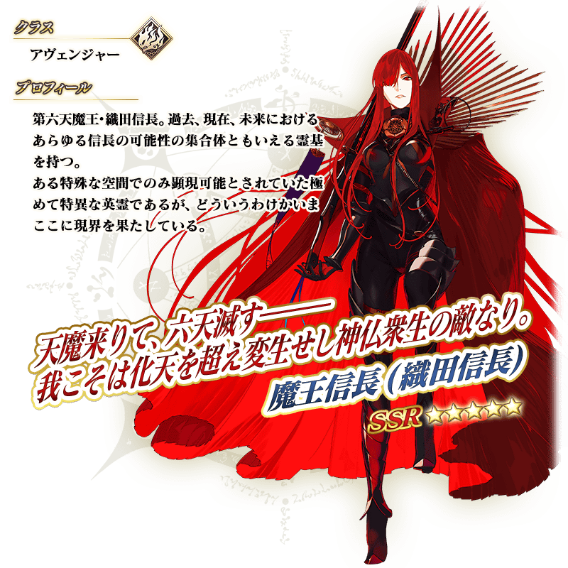 ※上述「★5(SSR)魔王信長(織田信長)」的立繪與卡面為靈基再臨第3階段。 ※「★5(SSR)魔王信長(織田信長)」是「★5(SSR)織田信長」靈基再臨到第3階段後名稱會變成「★5(SSR)魔王信長」。