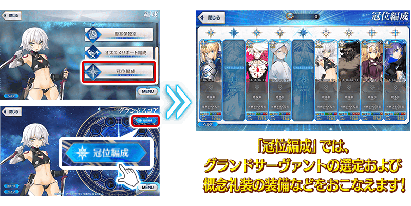 「冠位編制」中,冠位從者的選定和選定解除外,可進行設定裝備的概念禮裝等。