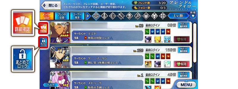 於「詳細確認」與目前同樣地能確認好友或跟隨的從者與概念禮裝詳情。