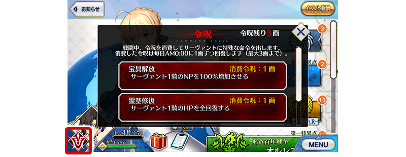④在管理室(ターミナル)畫面及地圖畫面中點擊令咒圖示時變更成會跳出令咒視窗 管理室(ターミナル)、區域地圖畫面中,在點擊畫面左下的令咒圖示時變更成會顯示令咒視窗。