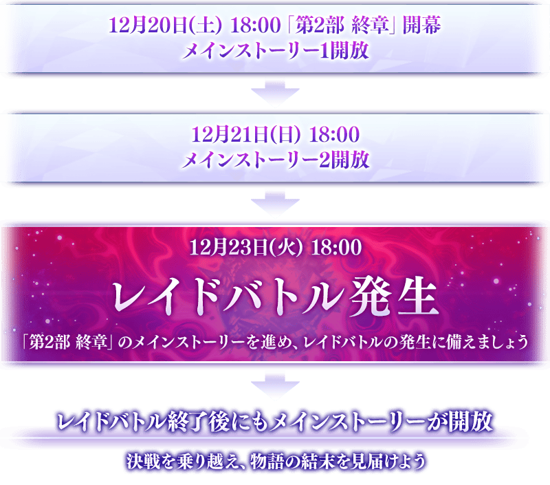 為了變得可參加推進在12月21日(日) 17:00開放的主線故事後,在12月23日(二) 17:00發生的團體戰,提前推進「第2部 終章」的主線故事吧。