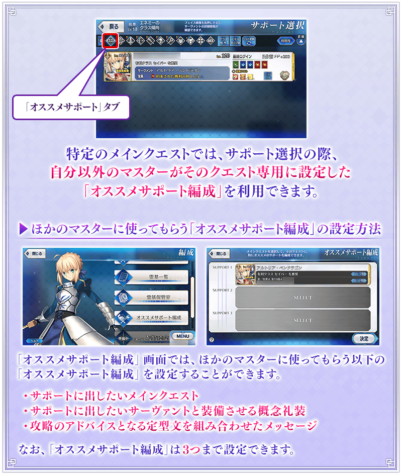 自編制畫面的「推薦支援編制」,可選擇從者與概念禮裝、以及從固定詞之中設定想要的訊息與成為對象的關卡。