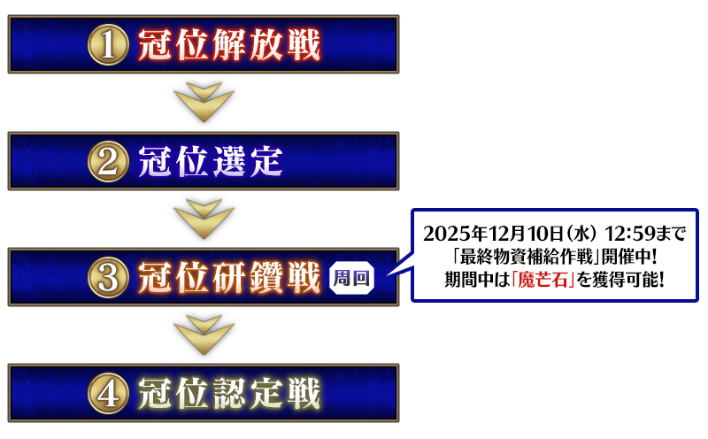 「冠位戴冠戰」由「冠位解放戰」「冠位鑽研戰」「冠位認定戰」3個構成,通過各自的戰鬥的話變得能進行「冠位從者的選定(冠位選定)」和「冠位刻痕的強化」等。
