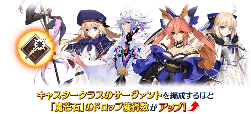 對象關卡中可獲得的「魔芒石」掉落獲得數,每多1騎編制到隊伍的Caster職階從者就增加1個。