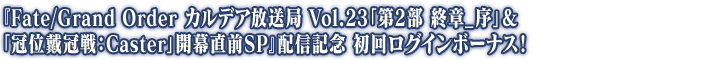 由於在『Fate/Grand Order 迦勒底放送局 Vol.23「第2部 終章_序」&「冠位戴冠戰:Caster」開幕前夕SP』達成7萬轉貼,實施放送記念登入獎勵!
